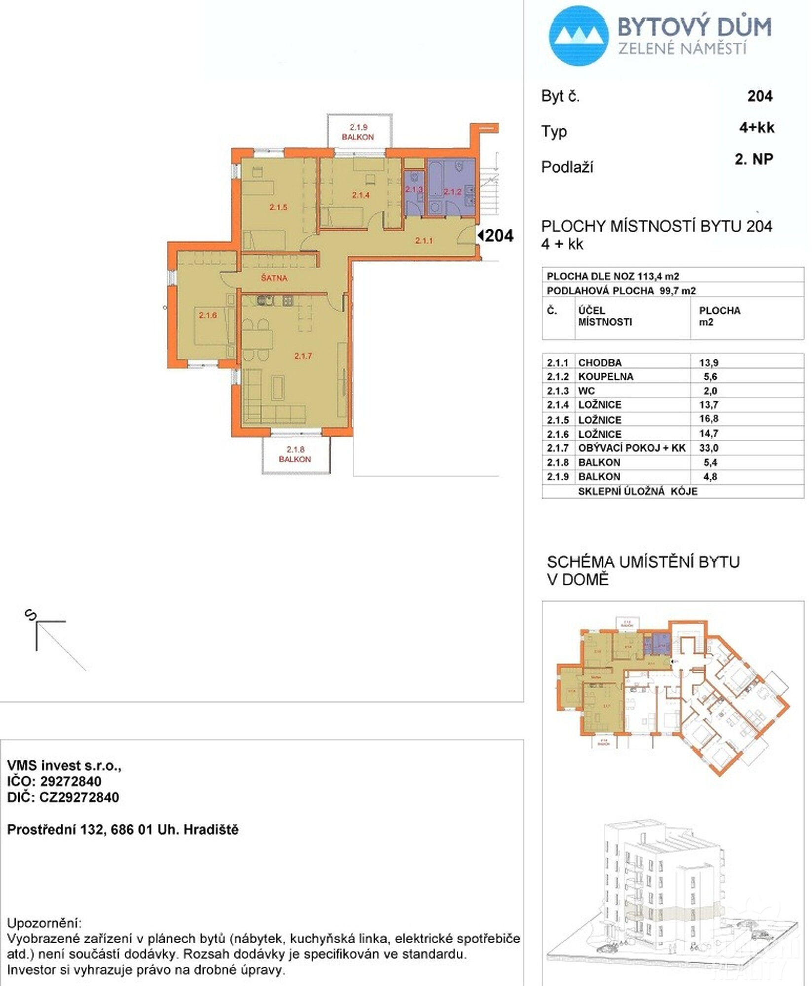 Naše společnost Vám exkluzivně nabízí k prodeji nadstandardně prostorný byt o dispozici 4+kk v novostavbě s čistou podlahovou plochou 100 m² + 2 balkony (5,4 m² a 4,8 m²). Byt je situován ve 2. nadzemním podlaží moderního bytového domu s výtahem na ulici Verbířská v Uherském Hradišti. K bytové jednotce náleží vyhrazené garážové parkovací stání přímo v domě, které je pohodlně přístupné z interiéru, což oceníte zejména za nepříznivého počasí. Samozřejmostí je také sklepní prostor. Byt je zcela nový a dosud neobývaný, připravený k dokončení dle Vašich individuálních představ. Budoucí majitel si tak může interiér přizpůsobit přesně svému stylu a potřebám a vytvořit si skutečně osobité a funkční bydlení. Vysoký standard vybavení zajišťuje maximální komfort – podlahové vytápění přináší příjemné teplo v celém bytě, venkovní elektricky ovládané žaluzie umožňují regulaci světla i soukromí a klimatizační jednotky v každém pokoji zajišťují ideální teplotu během letních měsíců. Byt je dále vybaven trojskly v oknech a kvalitními laminátovými podlahami MEISTER. Byt disponuje dvěma toaletami, z nichž jedna je samostatná a druhá je součástí koupelny. Dispozice bytu je navržena s důrazem na praktičnost, dostatek prostoru a přirozené světlo v jednotlivých místnostech. Lokalita nabízí kompletní občanskou vybavenost v docházkové vzdálenosti – školy, školky, obchody, služby i možnosti volnočasových aktivit. Zároveň poskytuje klidné a příjemné prostředí pro rodinné bydlení s výbornou dostupností do centra města. Díky kombinaci moderní architektury, kvalitního provedení, promyšlené dispozice a atraktivní lokality představuje tato nabídka ideální volbu pro klienty hledající komfortní, reprezentativní a dlouhodobě hodnotné bydlení. Pro více informací nebo sjednání prohlídky nás neváhejte kontaktovat telefonicky či e-mailem.