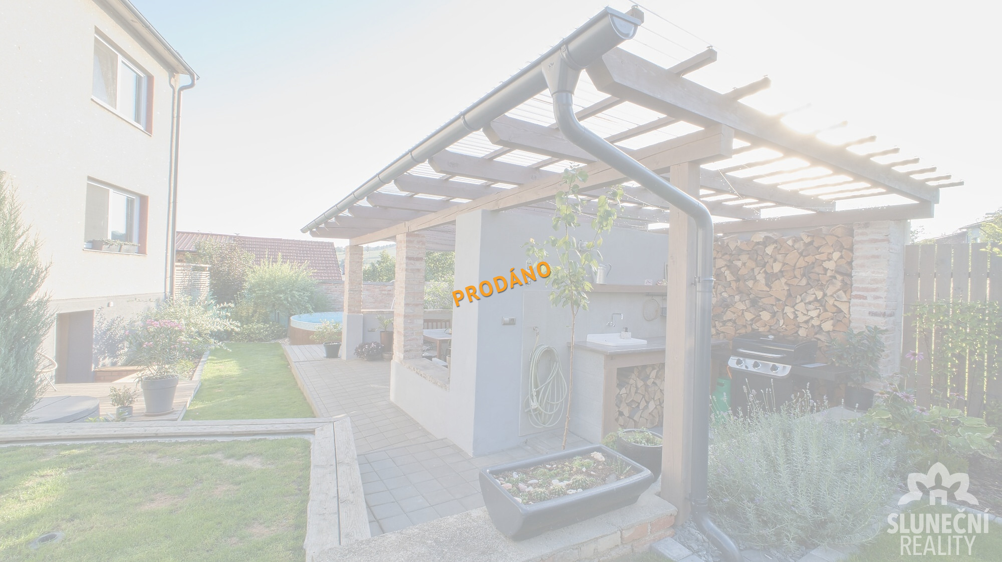 Oplocený dvůr nabízí naprostý klid a soukromí. Nachází se zde zastřešené posezení, venkovní kuchyně, bazén i vyvýšené záhony. Na dvoře je kombinace trávy, zámkové dlažby a modřínové podlahy.