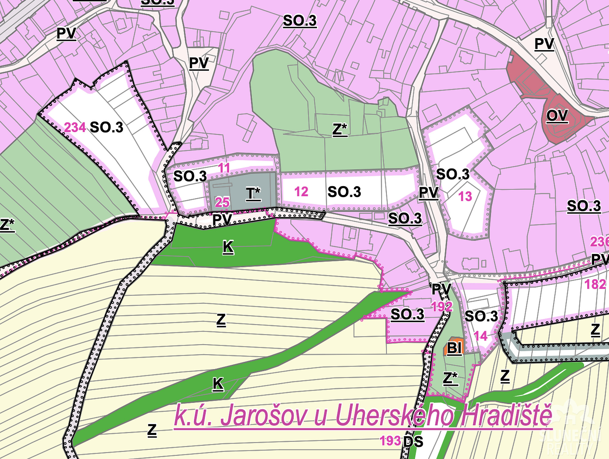 SO.3 – Plochy smíšené obytné vesnické (7 773 m²) Určeno zejména pro výstavbu rodinných domů venkovského charakteru. Přípustná je nízkopodlažní obytná zástavba, zahrady, komunikace, parkovací plochy a technická infrastruktura. Možné je rovněž drobné podnikání či občanská vybavenost menšího rozsahu, pokud nenaruší kvalitu bydlení. Nepřípustné jsou výrobní areály, sklady, čerpací stanice a jiné provozy zatěžující okolí.